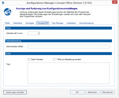 Da Concept EDI unbeaufsichtigt läuft, können Fehler einige Zeit unbemerkt bleiben. Für solche Fälle lässt sich hier eine Emailadresse hinterlegen, an die im Fehlerfall eine Email geschickt wird.