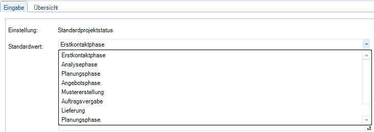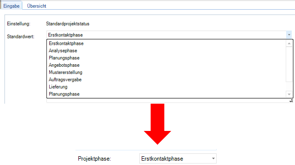 Unten ist ein Beispiel aus dem Modul Projekte zu sehen. Wird der Standardwert Erstkontaktphase als Standardwert bei der Neuanlage von Projekten ausgewählt und gespeichert, erscheint dieser automatisch im Feld Projektphase des Moduls.