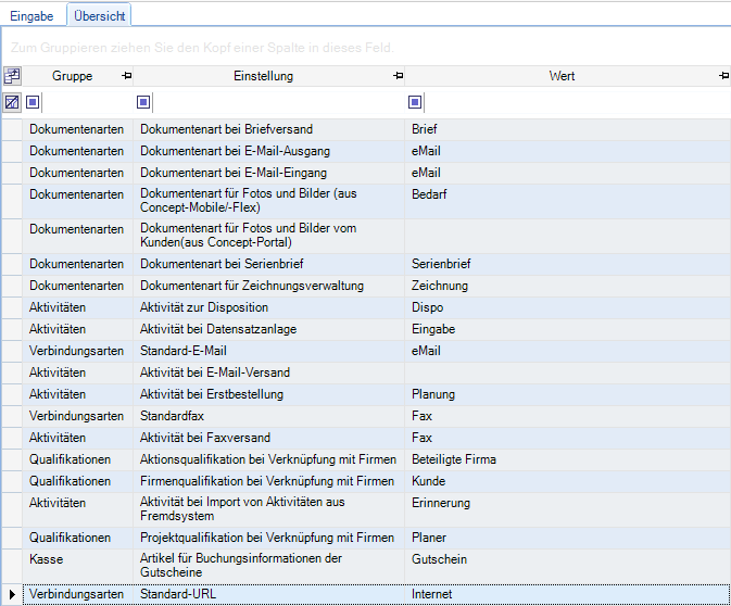 Die Neuanlage von Standardwerten ist nicht möglich. Es können nur die Ausprägungen der bestehenden Werte geändert werden. In der Übersicht sind alle Einstellungen, die zusammen mit dem Programm mitgeliefert werden, angezeigt.