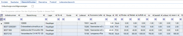 Hier finden Sie die Übersicht aller Bestellvorschläge. Die Mengen können Sie bei entsprechend eingestellten Rechten auch in Massenbearbeitung ändern.