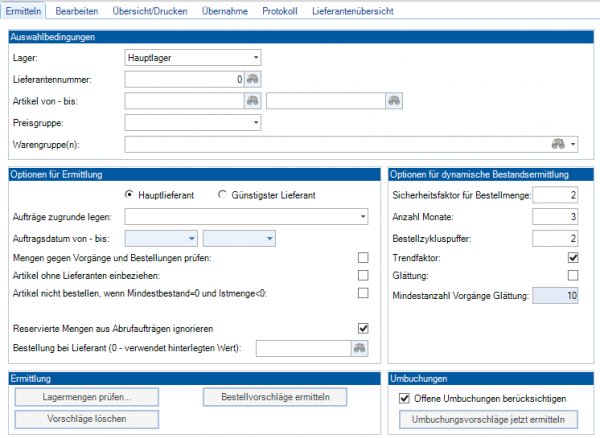 Hier werden die Bestellvorschläge in die Bestellungen übernommen. Sie können verschiedene Auswahlkriterien für die Übernahme setzen und wie in der Bestellübernahme aus dem Vorgang bestimmen, ob eine neue Bestellung erzeugt wird oder die Artikel an eine offene Bestellung angehängt werden.