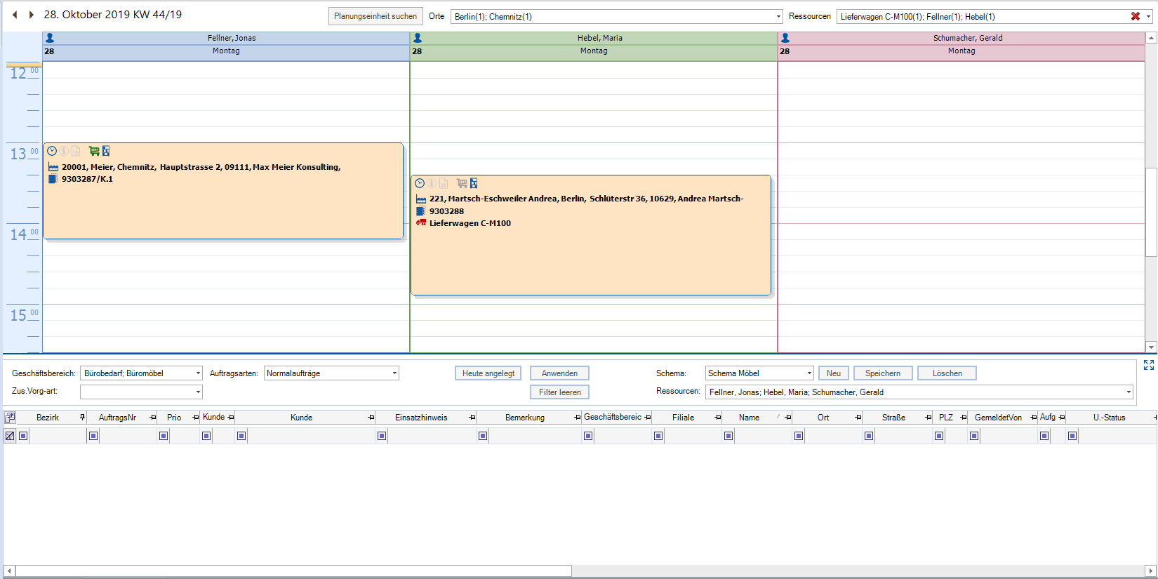 Es können mehrere Schemata gespeichert werden. Die Anwendung der hinterlegten Schemata selektiert die Mitarbeiter und die Aufträge entsprechend. Mit der Auswahl eines Filters werden je nach Auftragsart Spalten ein- bzw. ausgeblendet.