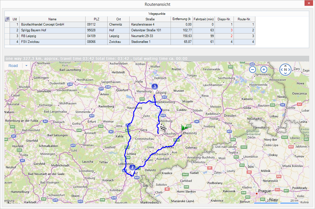 Der Webservice bekommt die Anschriften der Planungseinheiten als Wegpunkte übermittelt und errechnet die Fahrzeiten und Kilometer dazwischen. Darüberhinaus ist er in der Lage die optimale Reihenfolge, unter Berücksichtigung von Fixterminen, zu berechnen. Tagesbeginn bzw. Anfahrten von einer Privatanschrift (z.B. Service-Techniker) sind fix und auch dynamisch möglich und es werden Verkehrsdaten in der Karte angezeigt.