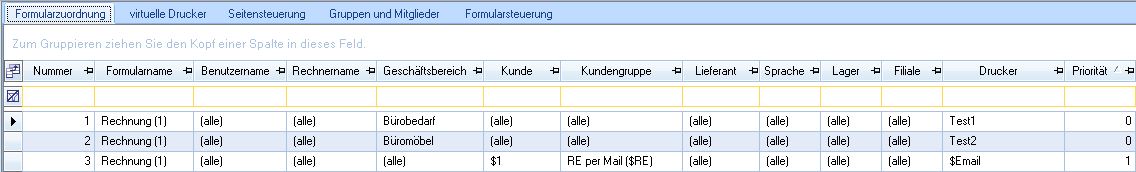 Da von der Rangfolge her der Geschäftsbereich vorrangiger als der Kunde / die Kundengruppe behandelt wird, muss in dem Fall mit der Priorität gearbeitet werden und dazu die Zeile mit der Kundengruppe für den Mailversand eine höhere Priorität als die Zeilen für den Papierdruck erhalten.