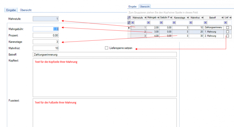 Beim Erreichen der dritten Mahnstufe, kann z.B. auch eine Liefersperre gesetzt werden. Über die Textfelder können die als Beschreibung dienenden Texte, wie der Betreff und der Kopf- und Fußtext, hinterlegt werden. Diese Eingaben werden beim Erstellen des jeweiligen Mahnschreibens mit in das Formular übernommen und können auch nochmals vor dem Erstellen der Mahnungen individuell auf diese angepasst werden.