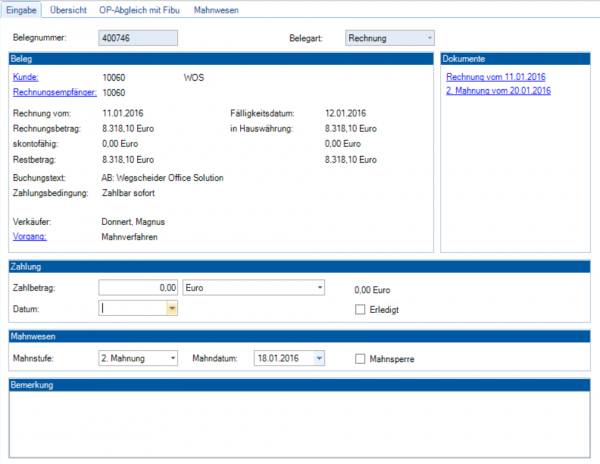 Im Modul OP-Verwaltung werden detaillierte Rechnungsinformationen und im System bereits erzeugten Mahnungen zu dem gewählten Vorgang angezeigt.