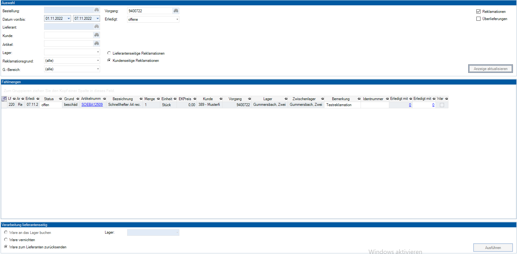 Im Modul Reklamationen können reklamierte Positionen aus einem Vorgang durch die Auswahl des Feldes ‚Kundenseitige Reklamation‘ und der Betätigung des Buttons ‚Anzeige aktualisieren‘ im Abschnitt Fehlmengen angezeigt werden.