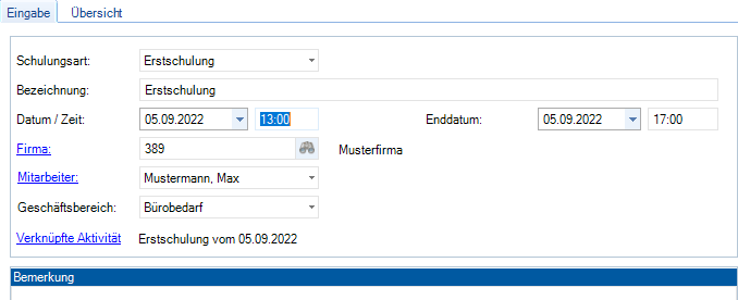 Im Feld Schulungsart können verschiedene Arten von Schulungen ausgewählt werden. Die Schulungsarten können im Strukturbaum unter Weitere Stammdaten angelegt und gepflegt werden.
