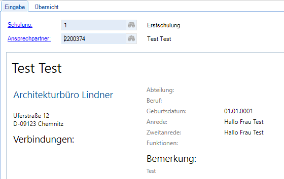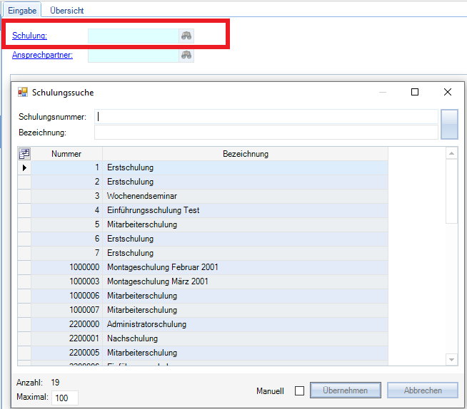 Im Reiter Eingabe besteht die Möglichkeit die Schulung (im gleichnamigen Feld) auszuwählen. Diese wurde vorher im Modul Schulungen angelegt.