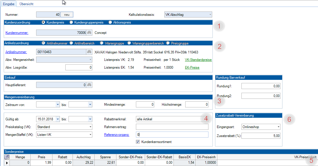 Zu einem speziellen Artikel lt. Artikelnummer, einem Artikelbereich, für eine Warengruppe, einem Warengruppenbereich oder einer Preisgruppe kann ein Sonderpreis oder Sonderrabatt angelegt werden.