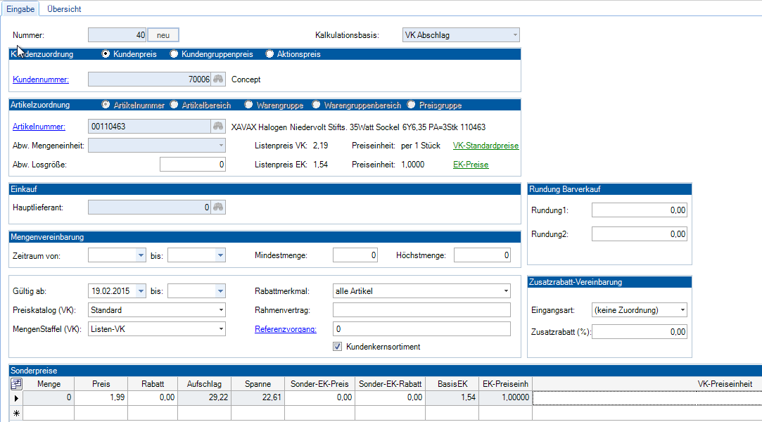 In dieser Rubrik werden die vereinbarten Sonderpreise oder Sonderrabatte hinterlegt, es kann an dieser Stelle auch eine Preis-Staffelung erfolgen.