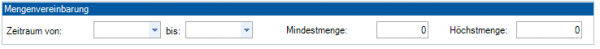 Hier kann der Zeitraum für die Gültigkeit von Mengenvereinbarungen zu der Sonderkondition hinterlegt werden und die für diesen Zeitraum vereinbarte Mindestabnahme- und Höchstmenge.