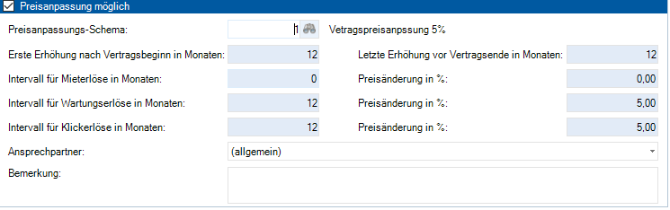 Bemerkung | Text | Eingabemöglichkeit für interne Bemerkungen, die auch im Vertrag im Reiter Rechnungsempfänger/Optionen in der Preisanpassung zu sehen sind, wenn das enstprechende Schema gewählt wurde. |