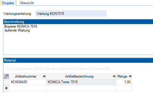 Das Anlegen von Wartungsanleitungen dient dazu, um routinemäßige Wartungs- und Instandsetzungsarbeiten vorzuplanen. Dabei werden die dafür benötigten Artikel und Tätigkeiten vordefiniert, um diese dann im TKD-Auftrag als Positionen aufzunehmen und später abzurechnen.
