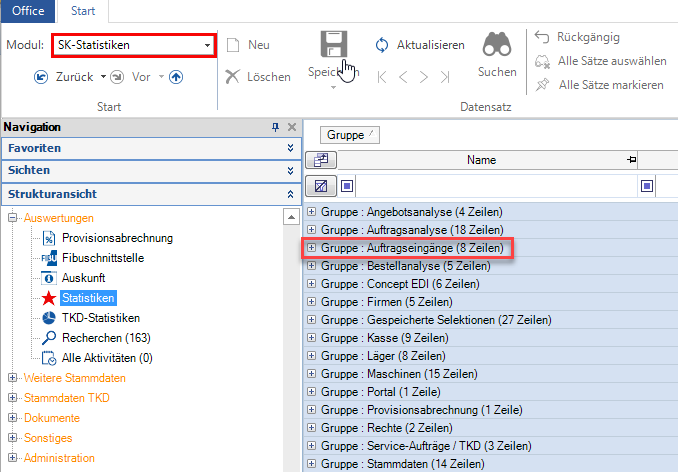 Auftragseingänge werden über das Modul Statistiken (Kürzel: SK) aufgerufen. Sie befinden sich in der Strukturansicht unter Auswertungen in Statistiken. Die gleichnamige Gruppe wird folgend angezeigt.