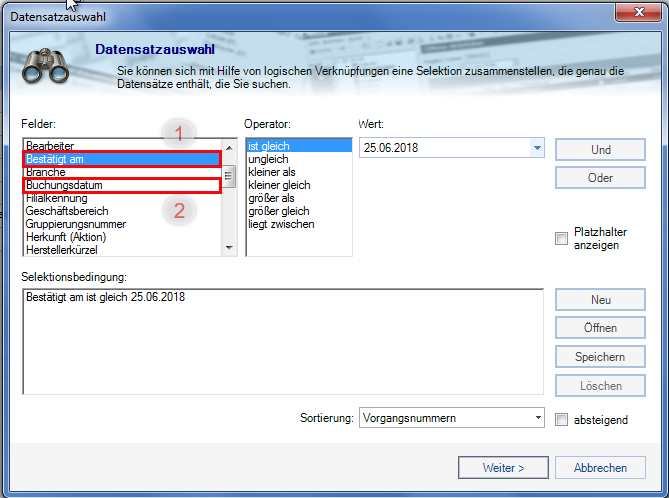Nach der Eingabe des entsprechenden Operators werden Einträge angezeigt, an deren Tag die Auftragsbestätigung ausgelöst wird.
