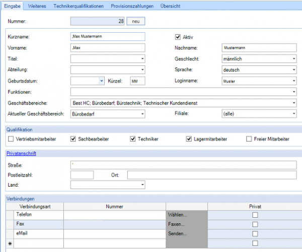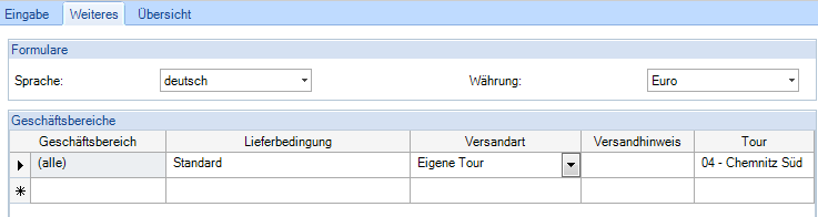 Im Modul Geschäftsbereiche, unter „Weitere Stammdaten“ werden die Geschäftsbereiche angelegt. Über die Aktivierung der Einstellung „Auslieferung über Touren“ wird automatisch die Tour-Nummer, aus der Lieferanschrift des Kunden in den Vorgang übernommen. Ist die Einstellung aktiv und an der Lieferanschrift keine Tour hinterlegt, dann kann der Vorgang erst gespeichert werden, wenn im Vorgang eine Tour, der Lieferanschrift zugeordnet wird.
