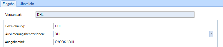 Im Modul Versandarten, unter „Weitere Stammdaten“ werden die Versandarten für Concept Office angelegt. Unter „Auslieferungskennzeichen“ kann ein Auslieferungskennzeichen hinterlegt werden. Wenn Daten für externe Systeme wie DHL bereitgestellt werden sollen, dann wird für die Ausgabe ein „Ausgabepfad“ hinterlegt.