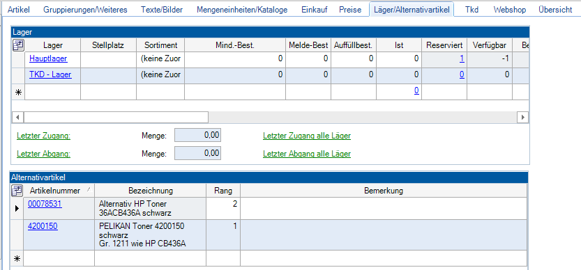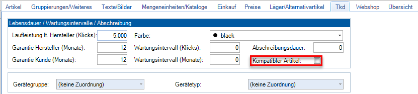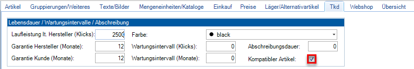 Handelt es sich bei der Alternative um einen kompatiblen Artikel (z.B. Refill, Rebuild usw.), muss dieser als kompatibler Artikel gekennzeichnet werden. Die Kennzeichnung erfolgt in der Registerkarte TKD.