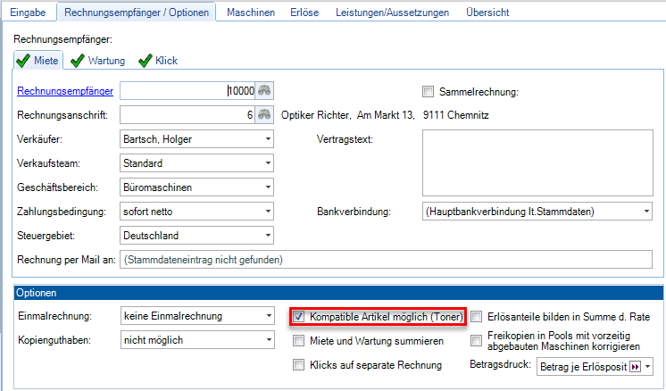 Die Verwendung von alternativen Verbrauchsmaterialien kann im Vertrag über die Registerkarte Rechnungsempfänger/Optionen und die Option Kompatible Artikel verwenden festgelegt werden.