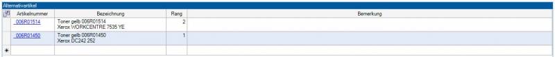 - es ist kompatibler Toner erlaubt, wird die Alternative mit dem höchsten Rang in den Auftrag aufgenommen, die an diesem Artikel hinterlegt ist. Zur Ermittlung werden aber nur Alternativen herangezogen, die im Artikelstamm als kompatibler Toner gekennzeichnet sind.