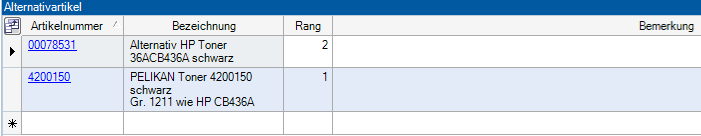 Zudem müssen sie am entsprechenden Originaltoner als Alternativartikel hinterlegt sein. Gibt es mehrere Alternativen, so sollte die Spalte Rang diese in eine Reihenfolge bringen. Der Alternativtoner mit dem höchsten Rang wird als Alternative eingesetzt.