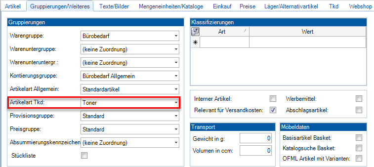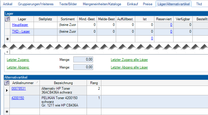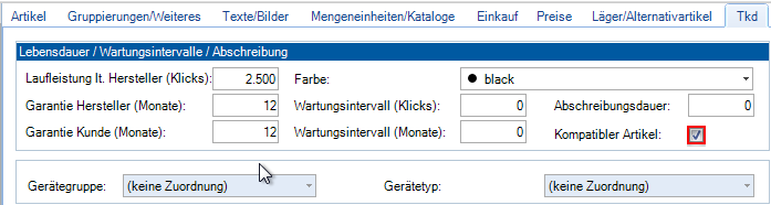 Alternative Toner müssen als solche im Artikelstamm in der Registerkarte TKD gekennzeichnet sein.