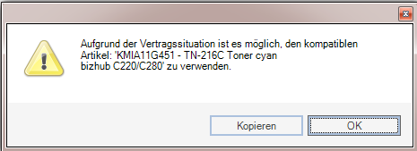 - es ist kompatibler Toner erlaubt, wird die Alternative mit dem höchsten Rang in den Auftrag aufgenommen, die an diesem Artikel hinterlegt ist. Zur Ermittlung werden aber nur Alternativen herangezogen, die im Artikelstamm als kompatibler Toner gekennzeichnet sind.