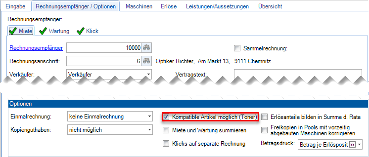 Die Verwendung alternativer Toner kann am Vertrag in der Registerkarte Rechnungsempfänger/ Optionen über Kompatible Artikel möglich freigeschaltet werden.