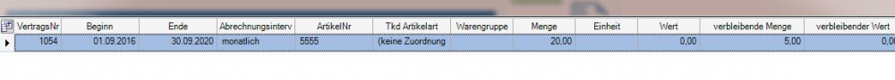 Im Vertrag werden an der Kontingentvereinbarung zwei Spalten verbleibende Menge und verbleibender Wert angezeigt, die den aktuellen Status angeben. Bei der Anzeige werden berechnete und noch nicht berechnete Kontingentleistungen berücksichtigt.