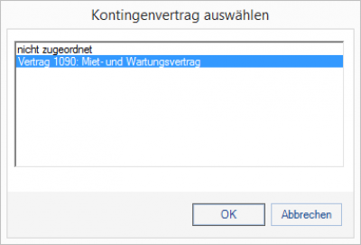 Durch Auswahl des Vertrags wird auf das Kontingent gebucht, Mittels Auswahl von „nicht zugeordnet“ wird die Zuordnung entfernt. In der Positionsliste wird zusätzlich angezeigt, ob die Position gegen das Kontingent gebucht wird.