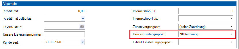 - Im Abschnitt „Allgemein“ befindet sich die Auswahlmöglichkeit für die Druck-Kundengruppe.