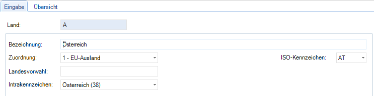 Jedes Land muss eine Zuordnung besitzen. Diese ist für die Ermittlung von Kontierungen notwendig. Nur 1 Land kann den Status „0 - Inland“ besitzen.