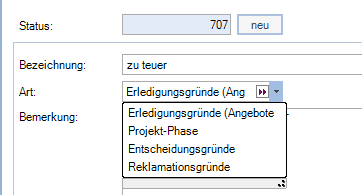 Für langfristige Auswertungen kann es interessant sein, warum ein Angebot nicht zum Auftrag wurde. Pflegen Sie die Auswertungskriterien als verschiedene Abschlussstatus ein und weisen Sie jedem verlorenene Angeboten einen Abschluss-Status zu.