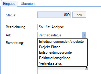 Für langfristige Auswertungen kann es interessant sein, warum ein Angebot nicht zum Auftrag wurde. Pflegen Sie die Auswertungskriterien als verschiedene Abschlussstatus ein und weisen Sie jedem verlorenene Angeboten einen Abschluss-Status zu.