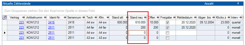 In der Spalte „Stand neu“ können nun die neuen Stände eingetragen und zusätzlich freigegeben werden. Das Häkchen bei „Freigeben“ wird automatisch beim Eintragen gesetzt. Sollen die Stände nicht freigegeben werden, müssen dieses manuell entfernt werden. Mit Speichern wird die Eingabe abgeschlossen.