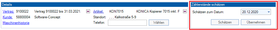 Im unteren Abschnitt des Moduls Zählerstandserfassung befindet sich neben dem Abschnitt „Details“ der Abschnitt „Zählerstände schätzen“. Zuerst wird das Datum ausgewählt, zudem die Schätzung gemacht werden soll. Standardmäßig ist das Feld mit dem aktuellen Datum befüllt. Abschließend auf „Schätzen“ klicken.