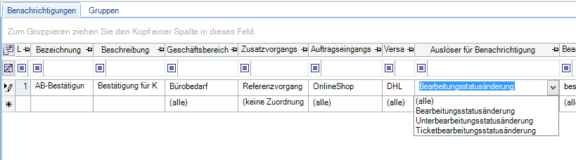 Zunächst kann für die Benachrichtigung ein fest definierter Kunde (=Kundennummer in Spalte Kunden) oder eine Benachrichtigungs-Gruppe (insofern diese im Register Gruppen angelegt wurde) hinterlegt werden. Wird kein Kunde bzw keine Kundengruppe definiert, so wird die Kunden-Spalte mit der Zahl 1 vorbelegt und hat zur Folge, dass das Ereignis für ALLE Kunden (1=ALLE) gilt. In der Bezeichnungs-Spalte wird die Benachrichtigung benannt und kann über die Beschreibungs-Spalte genauer beschrieben werden.