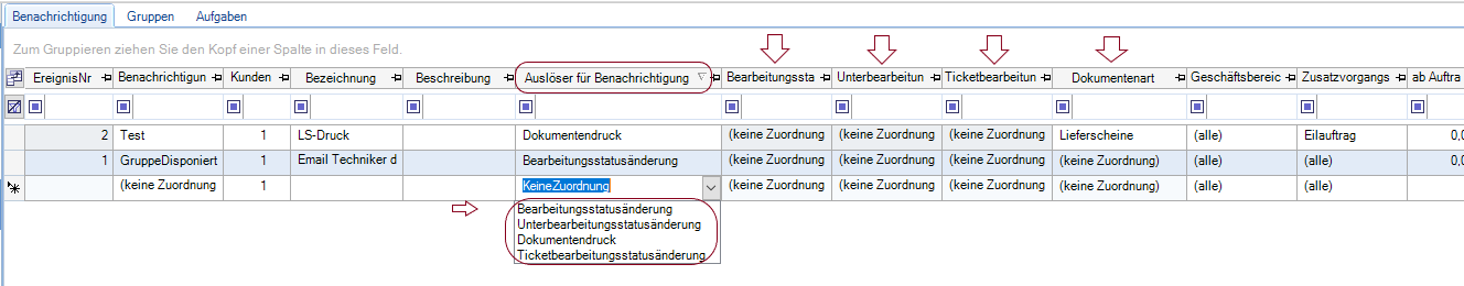 Wenn alle Voreinstellungen getroffen wurden, kann nun der Auslöser für die Benachrichtigung definiert werden. Dabei entscheidet die Wahl des Auslösers, welche Bearbeitungs-Spalte (siehe Pfeile) im Ereignis ausgewählt werden kann.