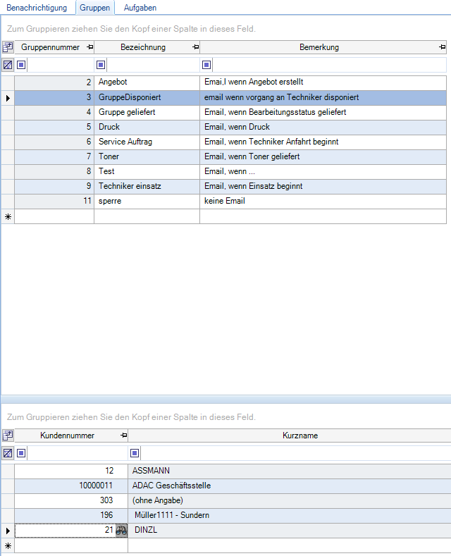 Da gewisse Benachrichtigungen nur für bestimmte Kunden benötigt werden, bietet es sich an, eine Kundengruppe für diese anzulegen. Dabei wird lediglich die Bezeichnung der Gruppe, sowie eine kurze Bemerkung hinterlegt. Im unteren Bereich werden dann die Kundennummern für die angelegte Kundengruppe hinterlegt. Sie können die Kunden über die Fernglassuche oder auch durch Direkteingabe der Kundennummer der Gruppe zuordnen.