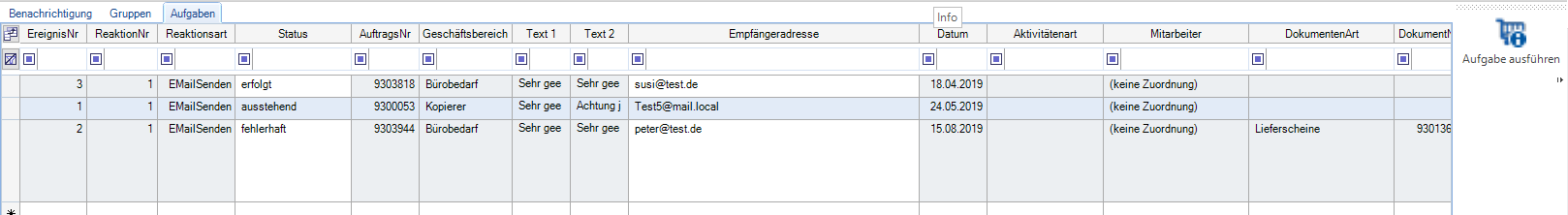 In der Reiterkarte Aufgaben werden alle ausgeführten Reaktionen, welche über ein Ereignis definiert bzw ausgelöst wurden, aufgelistet. Dabei zeigt der Status an, ob die Benachrichtigung erfolgt ist oder noch ausstehend ist. Auch fehlerhafte Status werden aufgezeigt, wo im Nachgang geprüft werden muss, was die Fehlerursache ist.