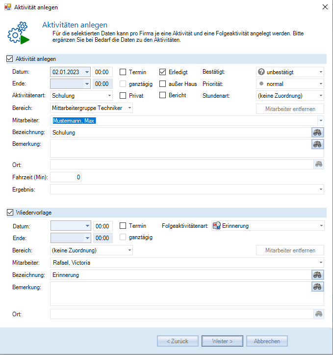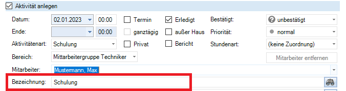 Überschreibt man die Bezeichnung nicht, bildet sich diese beim Speichern automatisch aus Aktivitätenart heraus.
