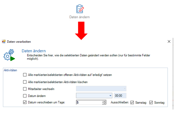Wird in der Übersicht der Aktivitäten nach Markierung einer Zeile der Button „„Daten ändern“ betätigt, so ist es nun möglich Aktivitäten um die angegeben Anzahl an Tagen zu verschieben. Zudem kann man angeben, ob eine Aktivität auf einen Samstag oder Sonntag fallen darf. es ist auch möglich Aktivitäten vorzuverlegen, mit z.B. -5 Tage.