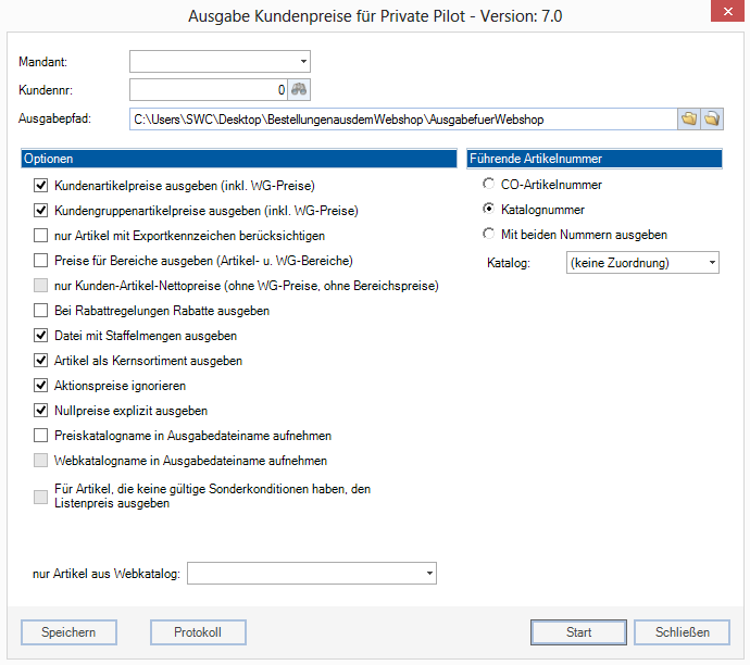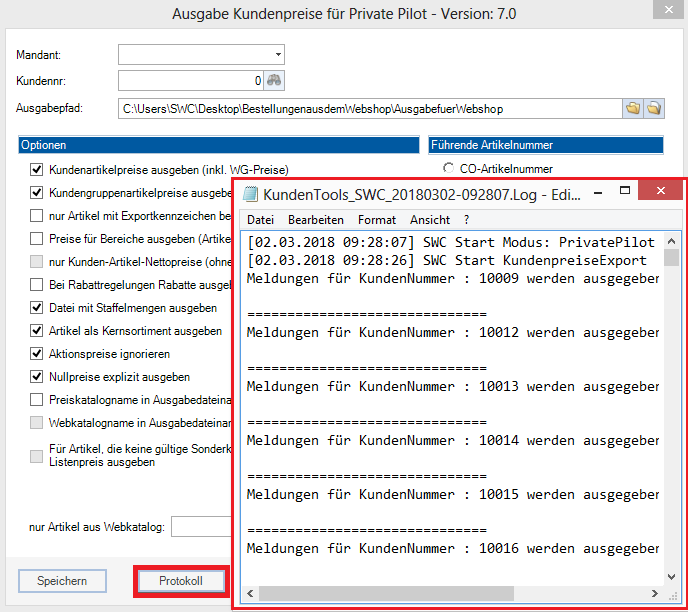 Ist die Parameterauswahl abgeschlossen, dann werden die Kundensonderpreise über den Button „Start“, in das Zielverzeichnis ausgegeben. Für jeden Kunden wird eine eigene Datei erzeugt. Zur Überprüfung kann das Protokoll eingesehen werden, in dem die ausgegebenen Dateien gelistet sind und auch Fehler vermerkt werden.