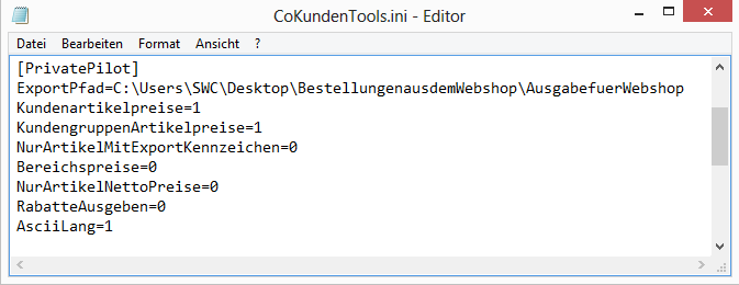 Für die Ausgabe der Kundensonderkonditionen muss in der Datei „COKundentools.ini“ ein Eintrag mit dem Ausgabepfad angelegt werden. Die Datei „COKundentools.ini“ ist im Pfad ..\Sysdata