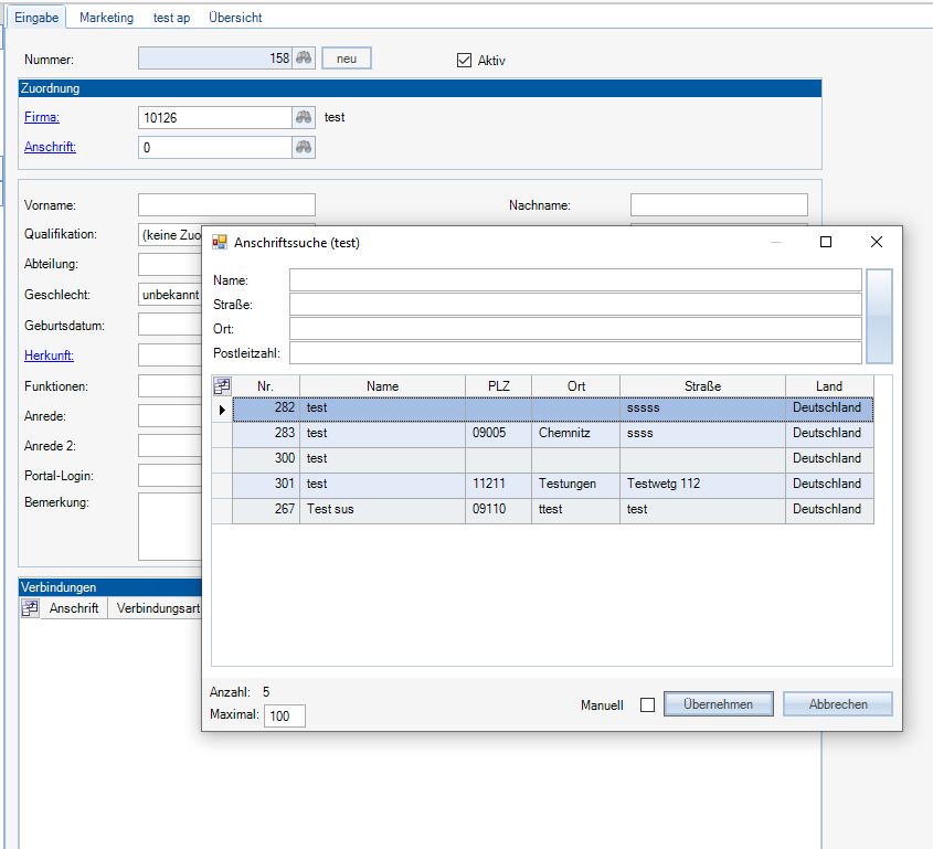 Als nächstes wird die passende Anschrift gewählt. Dabei werden nur die Anschriften der bereits ausgewählten Firma angezeigt.