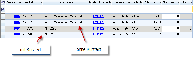 Die hier eingegebene Kurzbezeichnung wird im Programm an verschiedenen Stellen angezeigt und soll Bildschirmplatz sparen, da normale Maschinenbezeichnungen oft sehr lang sind. Im folgenden Bild wird ein Ausschnitt der Zählerstandserfassung gezeigt. Die oberen beiden Maschinen haben keinen Kurztext (die normale Bezeichnung wird gezeigt), die beiden unteren besitzen einen Kurztext. Die Spalte könnte bei den unteren Maschinen schmaler gezogen werden.