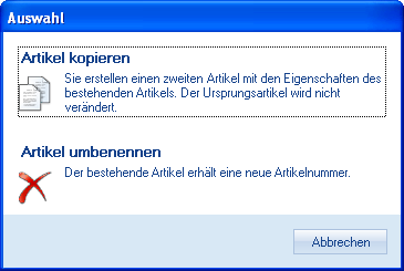 Das Feld Artikelnummer ist normalerweise vor Veränderung geschützt und ausgegraut dargestellt. Ist es nötig die Nummer zu ändern, muss der betroffene Artikel zuerst im Modul Artikel geladen werden, Durch Aufruf der Menüfunktion Speicher unter erscheint folgendes Dialogfenster: