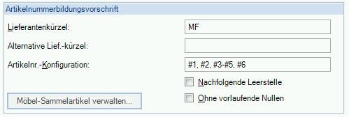 Wird ein Lieferantenkürzel angegeben, wird dieses bei der Anlage vorangestellt. In der Artikelnummer-Konfiguration lassen sich zeichengenaue Umwandlungsregeln definieren