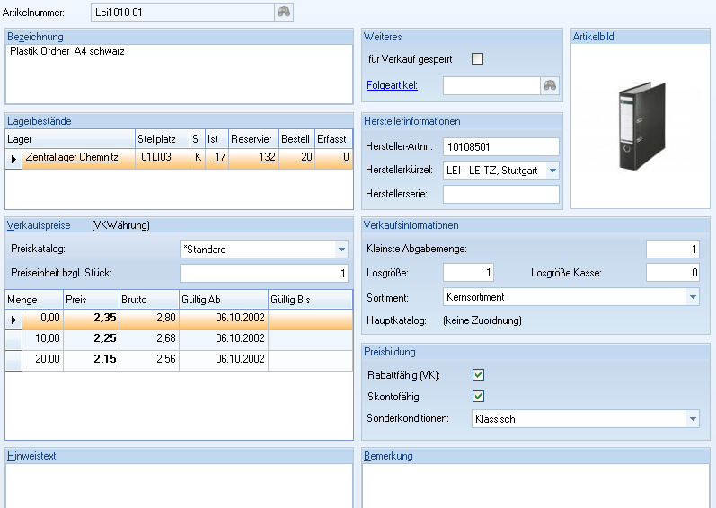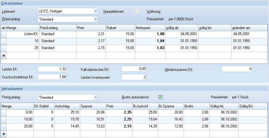 Verkaufspreise | Bereich | Aktuelle Verkaufspreise des Artikels (Anzeige anhand ausgewähltem Preiskatalog) |